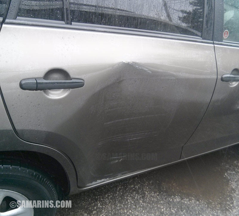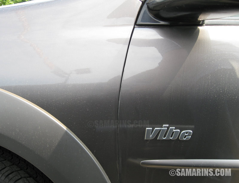 Here is a trick: if something doesn't look right, compare it to another side. For example, this Pontiac Vibe was offered for sale at a new car dealership. A salesperson told us that they just got this car. While checking, we found that the gap between the front fender and the door looks wide on the right side. |