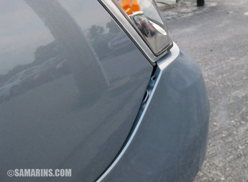 The corner of the front bumper is loose in this car. If you look closer, the bumper color is different too. It looks like there was a body repair in this corner. If you notice something like this, the area should be inspected closely. |