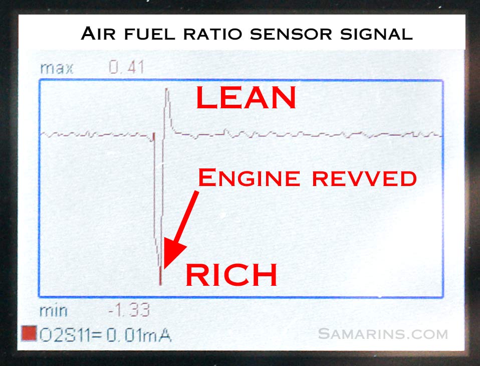 Then, depending on the trouble code, the sensor signal must be tested with a scan tool. For example, see this chart of the air-fuel ratio sensor signal on a scan tool: when the engine is revved, the signal jumps to "rich", then as the RPM drops and the fuel is cut off, the sensor indicates "lean". After that, the signal goes back to normal. This air fuel sensor works properly.