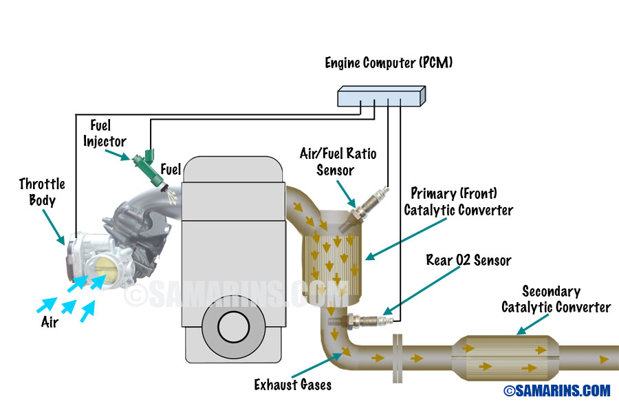 stoichiometric air-fuel ratio, the engine computer or PCM uses the signal from the air/fuel ratio sensor (front O2 sensor) that is installed before the primary catalytic converter. The rear O2 sensor monitors the efficiency of the catalytic converter.