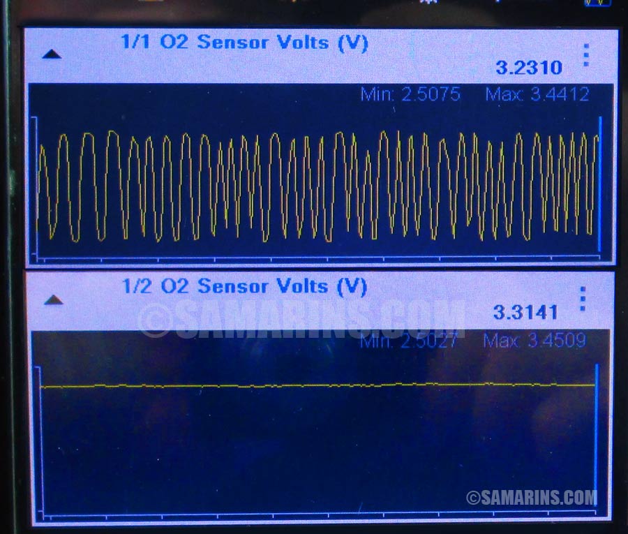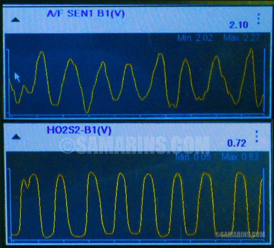 Bad catalytic converter. The rear O2 sensor signal (below) repeats the A/F ratio (front O2) signal (above).