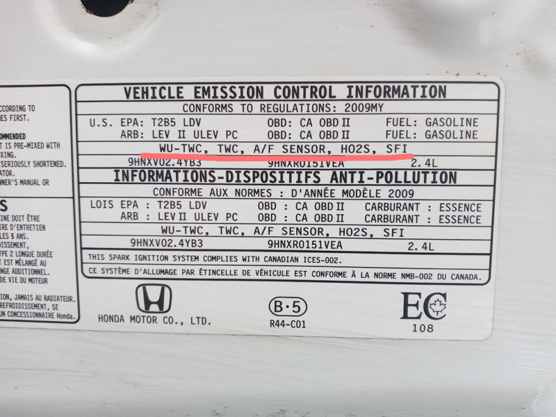 For example, this sticker from the 2009 Honda Accord, located on the inside of the hood, says that it has WU-TWC and TWC catalytic converters as well as an air/fuel ratio or A/F sensor and a rear O2 sensor, or HO2S. SFI means sequential fuel injection.