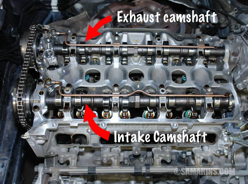 timing belt or chain with a tensioner and other related components. A timing belt must also be replaced at regular intervals. The timing chain lasts longer, but it too might need to be replaced if stretched. Another downside is that it's more difficult to implement variable valve timing separately for exhaust and intake valves; something that can be easily done in a DOHC engine.