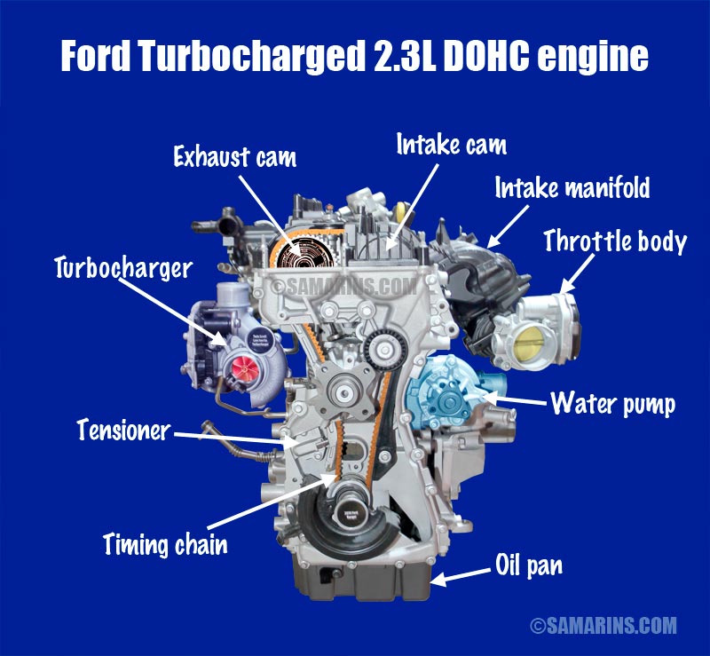 Ford 2.3L EcoBoost turbocharged DOHC engine.