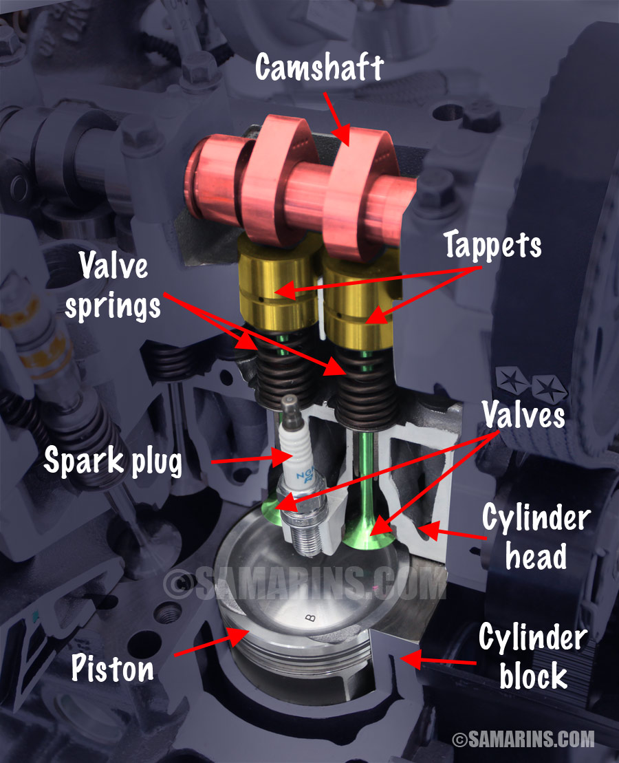 A typical DOHC engine has two camshafts and four valves per cylinder, like the one in this animation. One camshaft operates intake valves, while another camshaft controls exhaust valves on the opposite side.