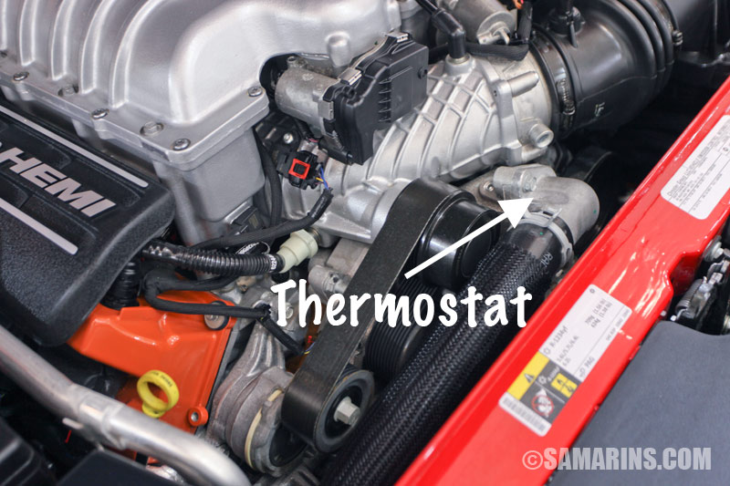 photo of a thermostat housing in the Dodge Charger SRT Hemi engine.
