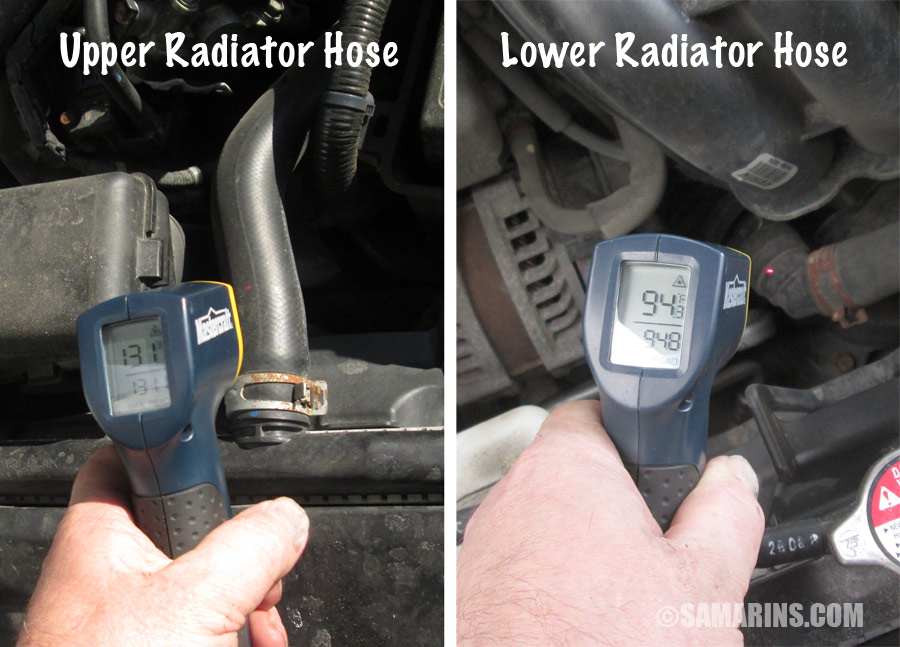 Can you test the thermostat without removing it? Mechanics test the thermostat by measuring the temperature of the upper and lower radiator hoses with an infrared thermometer, while monitoring the engine temperature with a scan tool. See the chart below.
