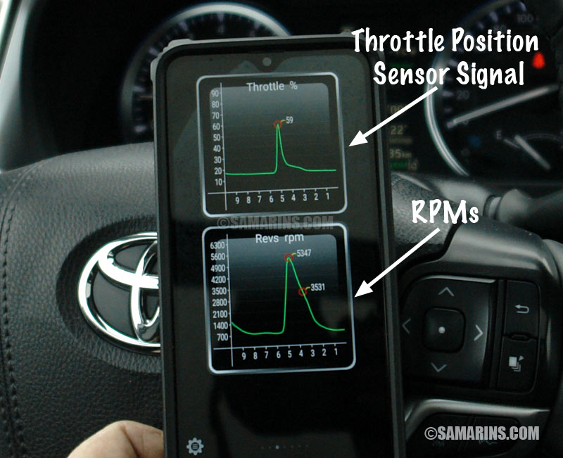 Here, we checked the throttle position sensor voltage with the Torque app. As you can see the signal is stable and has no spikes. If the signal of either of the sensors cuts out or spikes, the sensor is bad and the throttle body needs to be replaced (unless repair parts come separately).