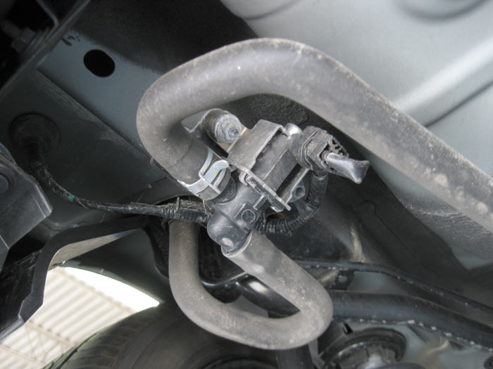 The Honda service manual says to test the valve while it's installed in its place at the canister located underneath the car. For a better demonstration, we removed the vent valve and tested it separately.